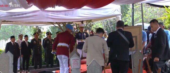 Di mimbar dekat liang lahat, Presiden Prabowo, yang mengenakan setelan jas bewarna hitam lengkap dengan kopiah hitamnya, mengawali prosesi upacara dengan menerima laporan dari komandan upacara, yaitu Kolonel Inf. Benny Angga.