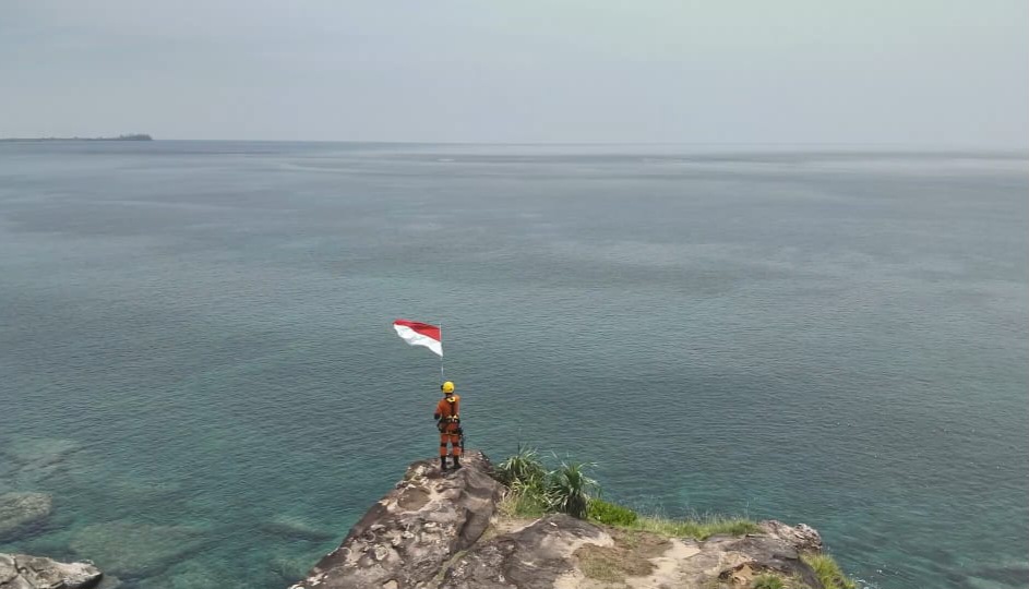 Natuna, Posmetrobatam.co: Kantor Pencarian dan Pertolongan Natuna sukses mengibarkan bendera Merah Putih raksasa di Tebing Tanjung Datuk, Teluk Buton, Kecamatan Bunguran Utara, Kabupaten Natuna,