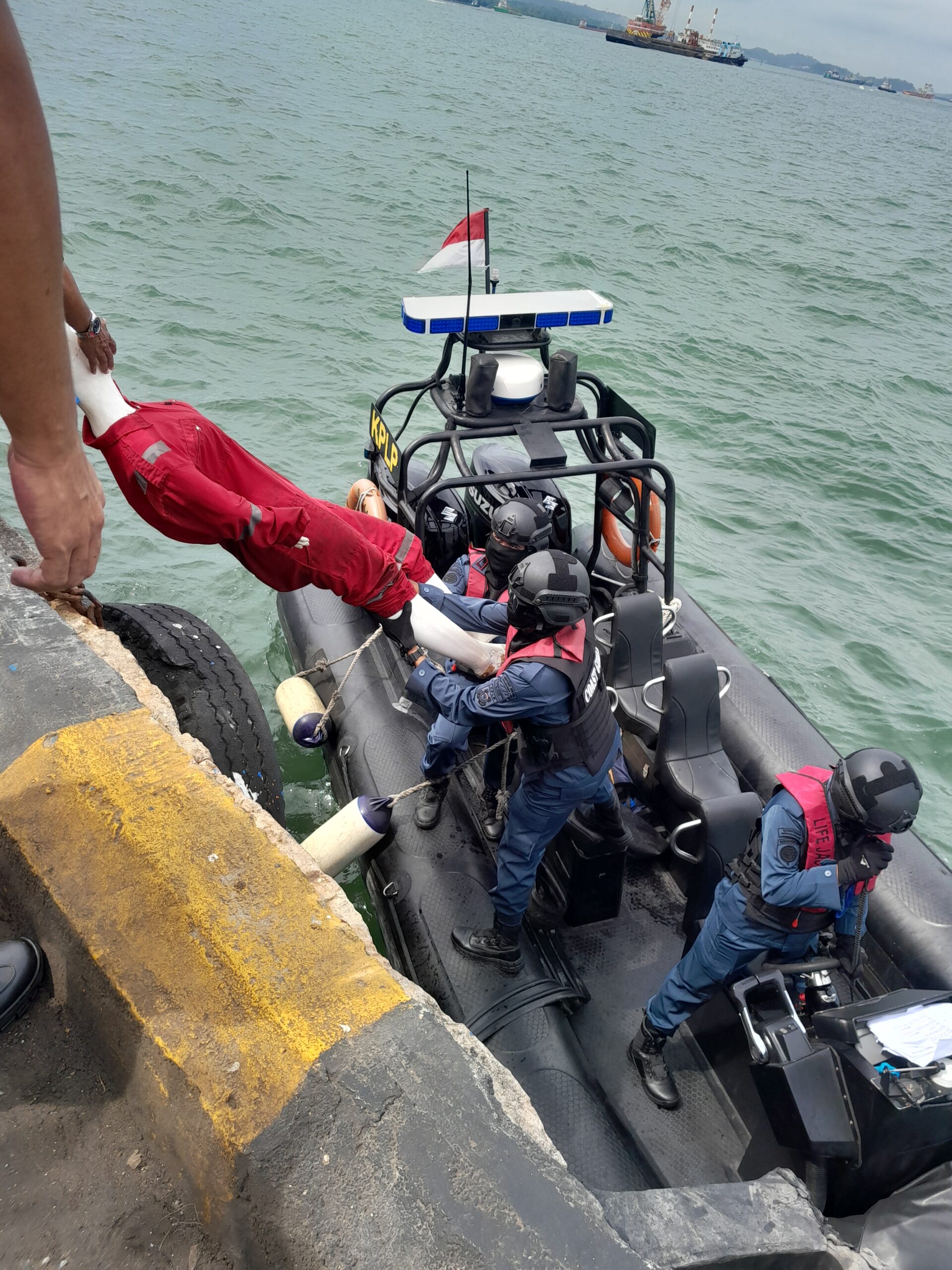 Beberapa jam kemudian, datang skoci petugas KPLP membawa dua korban ABK (dari manikin) yang mengenakan wearpack. Tanpa pakai tandu, tubuh korban diangkat dengan cara diangkat dan dijulurkan ke atas dermaga. Selanjutnya dibawa ambulan ke rumah sakit.
