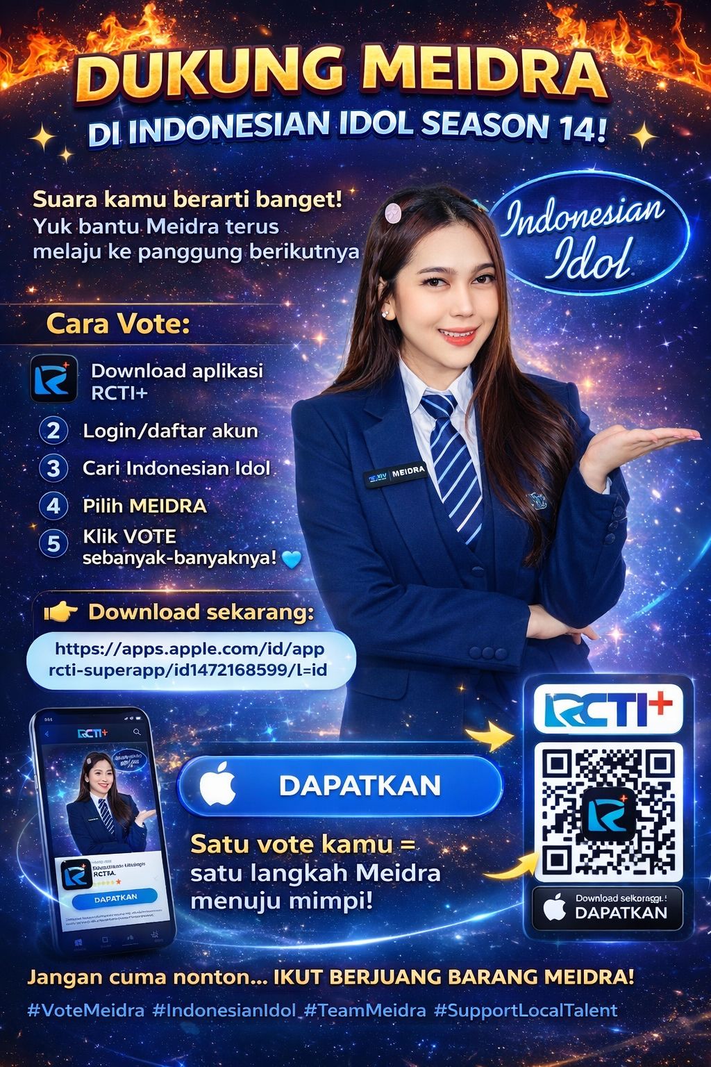 Jangan hanya menonton, mari kita tunjukkan solidaritas dan dukungan nyata untuk Meidra. Satu suara dari Anda adalah satu langkah besar bagi Meidra untuk menggapai mimpinya menjadi bintang Indonesian Idol.