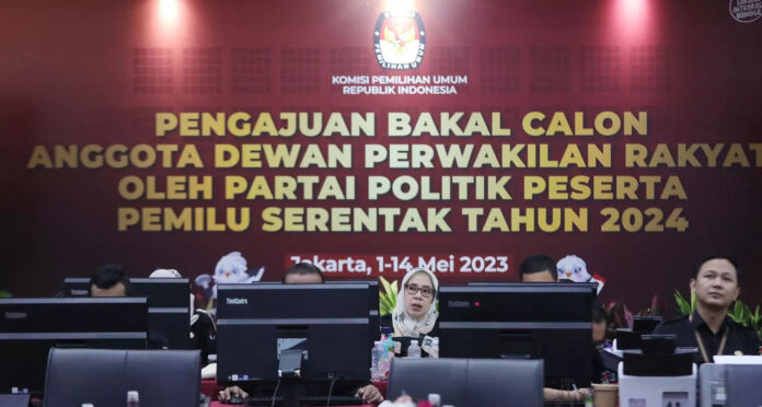 Petugas KPU Pusat melakukan verifikasi berkas pengajuan bakal calon legislatif (bacaleg) Pemilu 2024 di Kantor KPU Pusat, Jakarta, Minggu (14/5/2023). (Fedrik Tarigan/ Jawa Pos )