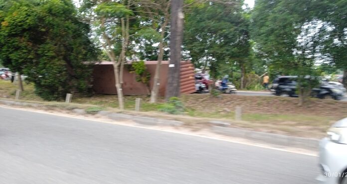 Keseluruhan badan kontainer yang dibawa truk berlogo IRN itu ‘terbang’ dan jatuh di median jalan, depan Perumahan Tiban Asri.